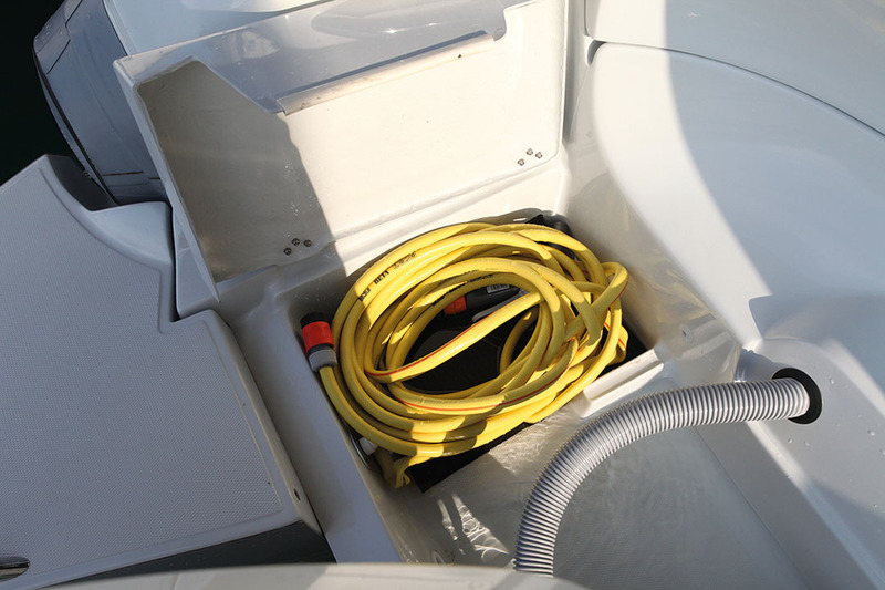 Le coffret bâbord, en bordure du bac moteur, permet de ranger amarres, ou tuyau de rinçage.
