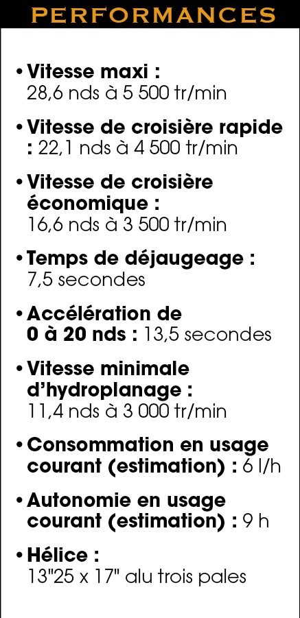 Au plan de performances, le bilan est contrasté. Si la vitesse de pointe est honorable, en dépit d'un antifouling sans lequel le BSC 50 prendrait 30 nœuds, les accélérations sont vraiment molles bien que le cabrage soit modéré au déjaugeage. Il n'est pas impossible qu'une hélice à pas plus court (une 15") soit préférable, considérant que nous avons atteint seulement 5 500 tr/min, à grand renfort de trim et en étant seulement deux à bord. Déjà en retrait de 500 tr/min par rapport au régime maxi motoriste, si le bateau était chargé, on perdrait encore quelques précieuses poignées de tours/minute. Si un changement d'hélice ne donnait pas satisfaction, nous conseillerions d'opter directement pour le 75 E-tec, ce dernier offrant près de 450 cm3 supplémentaires ! Son poids nettement plus important (+ 36 kg) ne devrait pas être un souci, car l'assiette du BSC, neutre, semble tout à fait à même de supporter cette surcharge pondérale. De même que son comportement général, très sécurisant, à la fois docile et précis. Un run dans le clapot cassant de l'Ile Rousse (l'essai s'est déroulé avec le concessionnaire local, Nauti Marine), nous a également montré que le Classic 50 ne craignait pas les vagues, restant confortable aux allures de croisière, entre 3 500 et 4 500 tr/min. Malgré son passage presque à plat en virage, ce petit BSC reste facile à contrôler grâce à sa légère glisse, mais sujet à la cavitation lorsqu'on braque serré.