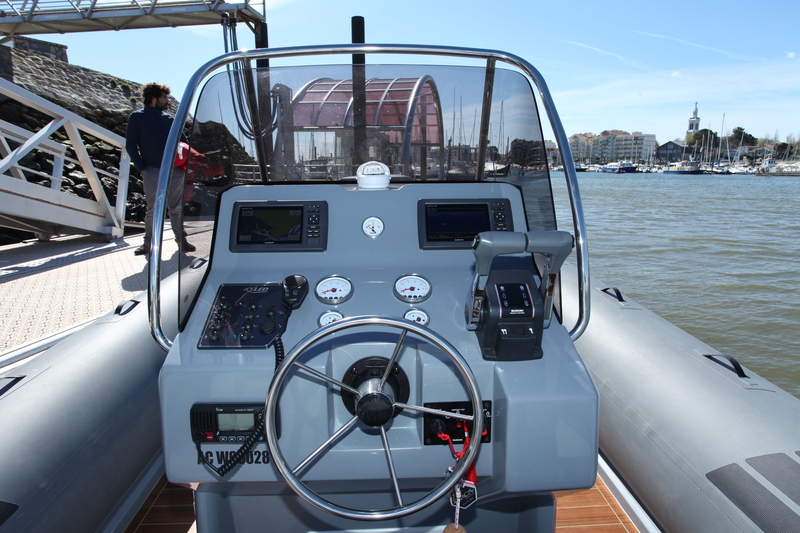 Spacieux le 28 GS XL ? Assurément. C'est même, dans sa catégorie, le semi-rigide le plus large commercialisé en France ! Dès l'embarquement, on éprouve une sensation d'espace. Une impression encore renforcée par la pose transversale des lames de teck (placage) et l'adoption d'un poste de pilotage plutôt étroit, laissant de vrais "boulevards" (49 cm !), de part et d'autre de la console et du leaning-post. De quoi se déplacer sans contrainte de la proue vers la poupe, et inversement. On peut d'ailleurs reprocher au chantier de ne pas avoir gagné une poignée de centimètres sur les passavants, afin de proposer un poste de pilotage véritablement biplace. En effet, l'assise du leaning-post n'est pas bien large pour deux adultes… Dommage, car la console est bien étudiée avec un retrait au niveau des genoux, permettant au pilote et au copilote de prendre de bons appuis sur le plancher, et son tableau de bord spacieux est bien agencé : compas dans l'axe de vision du pilote, boîtier de commandes "pupitre", espace pour intégrer une grande centrale de navigation (on peut y loger deux écrans de 9 pouces) et autre VHF, prise allume-cigare, adaptateurs USB, vide-poches à portée de main… Par contre, il manque une main courante dédiée au copilote, et un vrai volant remplacerait avantageusement la classique barre en inox, peu compatible avec le pilotage de bateaux rapides. Le dessin de l'assise du leaning-post gagnerait aussi à être revu…
