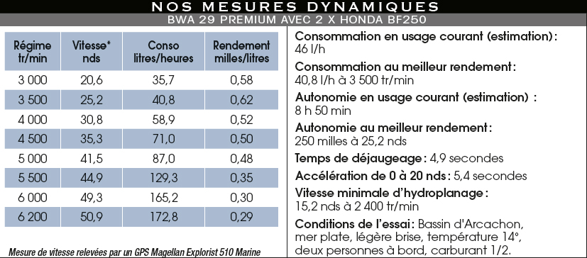 Puissant, rapide, le 29 Premium distille de bonnes sensations à la barre. D'autant que la carène se montre sensible à l'action des trims, ayant une belle propension à s'aérer à l'approche du régime maxi. Mais, alors apparaît un léger roulis qui peut inquiéter les pilotes non aguerris. Autre remarque, en sortant du Bassin, à la recherche d'un peu de relief marin, nous trouvons une houle d'environ un mètre. Le BWA passe sans trop impacter à la réception de petits décollages, mais son nez apparaît léger, même avec les trims en négatif. L'assiette n'est donc pas neutre. Sans doute le poids des deux V6 déplace-t-il le point d'équilibre vers l'arrière. Il nous semble que le 29 Premium serait mieux balancé en monomoteur, avec un Yamaha 350 ch (soit 211 kg en moins sur le tableau arrière) par exemple, ou s'il doit être propulsé par des Honda, par une paire de 4 cylindres, BF150 (142 kg de moins). D'autant que les performances, dans les deux cas seront encore satisfaisantes pour un semi-rigide à vocation familiale, avec sans doute un peu plus de 40 nœuds au régime maxi… Sinon, le comportement est franc, que ce soit en termes de tenue de cap, ou en courbe rapide où le BWA démontre une belle maniabilité, virant court pleins gaz, avec une précision et une docilité qui ne trahissent pas le barreur.