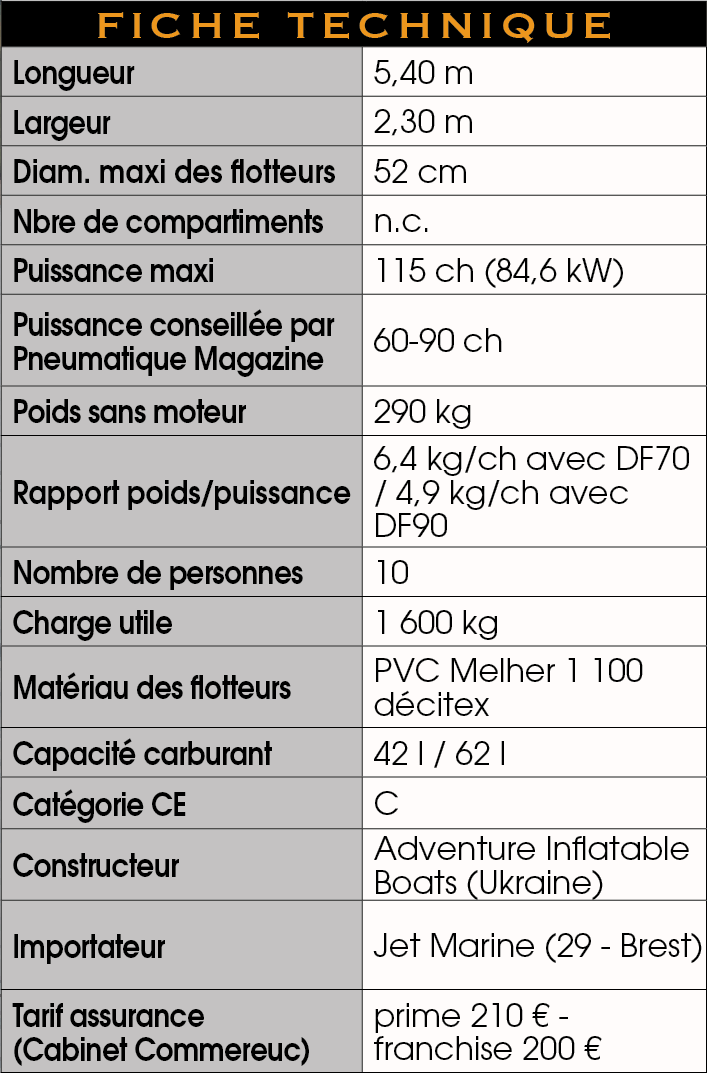Elle a beau venir d'un pays de l'Est, elle sait parler aux gens de l'Ouest ! Importée par Jet Marine, basé à Brest, la marque Adventure fait valoir des semi-rigides bien en phase avec le concept originel : légers mais aptes à supporter la charge, dynamiques mais sans besoin de recourir à une forte puissance, présentant bien mais sans envolée tarifaire… Bref, des pneumatiques qui collent bien au programme des utilisateurs de Manche et d'Atlantique. Le V550 est l'un des quatre modèles actuellement distribués en France. Ses trois frères sont les V450, V500 et V650 dotés, comme lui, d'une coque en polyester ceinte d'un flotteur en PVC Valmex de chez Melher Texnologies. Un bon point pour ce chantier d'Ukraine : l'ajout de valves de surpression pour éviter les dommages éventuels dus à une montée soudaine de la température estivale.