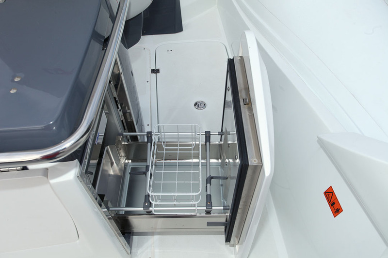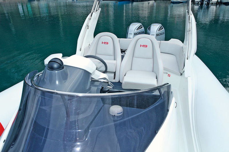 Avec 25° d'angle de quille au tableau arrière, le H9 appartient sans ambiguïté à la catégorie des coques en V profond. Ce dessin de carène s'est avéré efficace dans le petit clapot et la houle de sud-ouest naissante rencontrés entre Sorrente et Capri. L'étrave élancée et fine coupe la vague en souplesse et défléchit efficacement les embruns. Par contre, le court pare-brise (plutôt un déflecteur) ne protège quasiment pas les pilote et copilote. Et compte tenu du dessin particulier de la console, il ne faut pas s'attendre à une amélioration future… En revanche, la position de conduite est agréable, que ce soit debout, grâce à l'assise relevable pour offrir un appui amorti, ou assis avec le concours du cale-pieds moulé à la base de la console. De son côté, si le copilote profite d'un repose-pieds astucieux, la main courante qui lui est destinée se trouve un peu loin… Le tableau de bord, bien que compact en raison de la porte de cabine, est bien agencé autour du combiné Garmin, et offre une bonne lecture de tous les instruments.