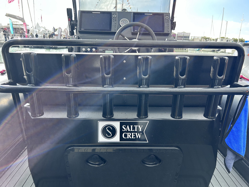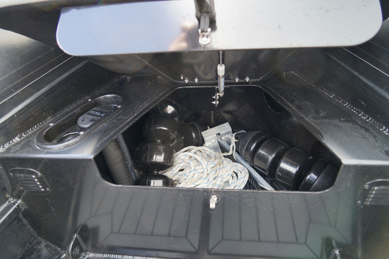 Comme son nom l’indique, le BlackPearl ne lésine pas sur le noir. Hormis le contraste avec les saisines rouges -d’un bel effet-, du moteur Mercury Verado 250 à la pointe avant, la couleur dominante rappelle les bateaux de travail. Il faut dire que pour le premier opus de ce bateau entièrement destiné à la pêche, le chantier d’Angles (Vendée), a mis l’accent sur la praticité. Les porte-cannes, les nombreuses zones de renfort sur les flotteurs et le très haut pare-brise donnent le ton. Une fois à bord, on observe une vaste bassine en avant du moteur pour « travailler » les poissons une fois ramenés à bord, avec un accès à la pompe de cale, et pour pouvoir réaliser la maintenance du moteur. Le revêtement de pont du BlackPearl 7 est en mousse EVA haute densité. Un revêtement que l’on retrouve à l’intérieur des coffres pour empêcher les équipements de glisser. La sellerie de la banquette arrière, de la console et des assises à l’avant sont en tissu synthétique permettant le passage de l’eau. Un avantage pour garder ses vêtements secs un peu plus longtemps. La banquette arrière dispose d’un très grand coffre sur vérins, atteignant quasiment le tableau arrière du bateau : de quoi stocker une à deux bouées couronne et la pompe de lavage à eau de mer de 4 bars de pression, servant à décoller les saletés après la pêche. Un éclairage de courtoisie courant tout le long du bateau ravira les matinaux ou les couche-tard. À l’avant de la banquette, se trouve le vivier de 160 litres intégré directement dans le pont. Il est équipé d’une pompe de remplissage et d’une autre de vidange. Cela permet en navigation de disposer d’un circuit ouvert pour que les poissons puissent vivre un peu plus longtemps à bord. À l’avant du vivier, juste au pied du leaning-post, a été appliquée une règle de mesure sur le sol allant jusqu’à 1 mètre. Ce leaning-post dispose d’une trappe à l’arrière ouvrant encore sur un vaste espace. Idéal pour stocker l’armement de sécurité, par exemple. Les porte-cannes sont fixés sur un arceau ceinturant la banquette et faisant office de solide main-courante pour le ou les passagers restés debout. Une fois face à la console, on apprécie le repose-pieds moulé et le siège bolster pour adapter son assise en fonction du rythme de navigation. L’électronique se compose de 2 écrans de 12 pouces, encastrés directement sur la console. Deux profondes boîtes à gants, avec leurs prises USB, se trouvent à l’aplomb du grand pare-brise, une protection de très bonne mesure puisqu’elle dépasse largement une personne d’1m80. La main-courante qui encadre la console permettra de garder une prise solide lors des déplacements en navigation. À l’avant de la console, une assise pour une personne abrite encore du volume et un accès au panneau électrique. Les gilets de sauvetage y seront bien à l’abri lorsqu’ils ne seront pas sur les épaules des passagers. Observées de près, les saisines de maintien révèlent une double tresse de couleur assortie au logo AtlantiCraft apposé sur les flotteurs. Un rappel que l’on retrouve également sur la sellerie. En complément de la zone de pêche située à l’arrière, la zone avant est vaste, dégagée et permettra des lancers de bonne envergure. Les renforts de flotteurs sont bien situés et transmettent une sensation de robustesse à l’ensemble. À la pointe, nous trouvons un coffre toujours équipé de vérins, abritant le nable à carburant bien isolé, la baille à mouillage et un accès pour permettre de faire passer l’ancre et la chaîne sur le davier situé sur la plateforme de proue. L’impression d’ensemble de ce BlackPearl 7, une fois à bord et après avoir soulevé les trappes et capots, est bien similaire à celle obtenue lors du premier coup d’œil. Pas d’ornements inutiles, pas d’excentricité ni de gadgets tape-à-l’œil, on se trouve bien à bord d’un bateau solide et équipé pour embarquer une bande d’amis déterminés à tirer le maximum d’une embarcation destinée prioritairement à la pêche.
