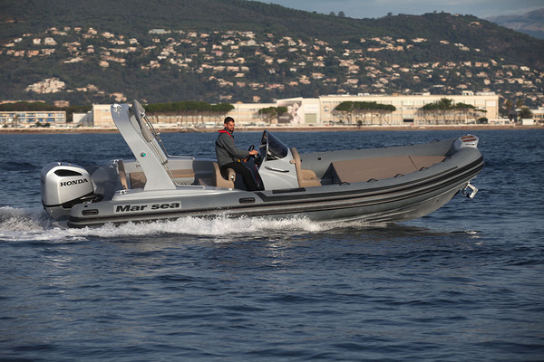 Cet imposant semi-rigide est le plus grand de la série Comfort et par la même occasion le plus grand des Mar.Sea. Les bateaux de cette famille, c’est écrit dessus, visent une clientèle familiale désireuse de prendre ses aises au mouillage, afin de profiter de la baignade, de s’adonner au bain de soleil ou de partager un pique-nique sur une vraie table. De ce point de vue, le grand Mar.Sea fait bien les choses, comme nous allons le voir en montant à son bord pour une revue de détail. Ensuite nous en prendrons les commandes pour juger de ses prestations en navigation.