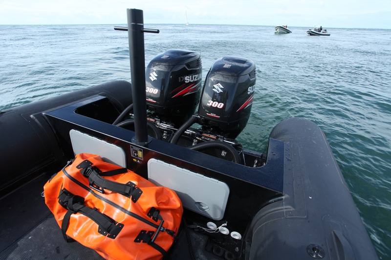 Le 950 est le plus grand modèle de la gamme OP qui regroupe pas moins de 16 semi-rigides dont les dimensions s’échelonnent de 3,35 m à 9,50 m. Une bonne moitié de ces bateaux doivent être considérés comme des annexes, le premier modèle véritablement intéressant pour des loisirs nautiques polyvalents étant le 540 OP. S’il existe un large fossé entre le 950 OP et son dauphin, le 720 OP, le premier nommé est très étroitement dérivé du second. Même silhouette, même identité de baroudeur dans sa robe intégralement noire (tubes, gel-coat et sellerie), le 950 OP est un 720 OP en plus grand. Nettement plus grand. Ce qui a permis de planter six sièges X-Craft en arrière de l’imposante console surmontée d’un T-top, ce dernier étant destiné à recevoir des appareils de mesure et la communication par satellite pour les bulletins météo. Sièges et console sont solidement fixés à l’aide d’inserts inox placés sous le pont construit en monolithique, avec sandwich en nid d’abeilles. Et il reste encore beaucoup de place en avant du tableau arrière intérieur, sur lequel se dresse un mât de traction qui, quand il ne sert pas au remorquage, s’acquitte de l’amarrage. Un tableau percé de six vide-vite, qui sert aussi de cale technique pour la centrale hydroélectrique du moteur, avec ses deux trappes d’accès. Pour ce qui est du carburant, Northstar a vu grand avec pas moins de 600 litres dans un réservoir en polyéthylène sous le plancher, allongé à fond de cale, afin d’abaisser le centre de gravité du bateau. Les deux batteries sont logées sous la console, qui sur sa face avant intègre un gonfleur électrique Turbomax. La partie avant présente une grand surface libre, avec au sol deux beaux coffres. Leurs lourds couvercles témoignent du sérieux de la construction. On peut sauter dessus du quai à pieds joints sans arrière-pensée ! Dans la pointe, se trouve deux autres coffres symétriques et, dans le même volume contremoulé, la baille à mouillage surmontée d’un second mât de traction, parfait également pour l’amarrage.