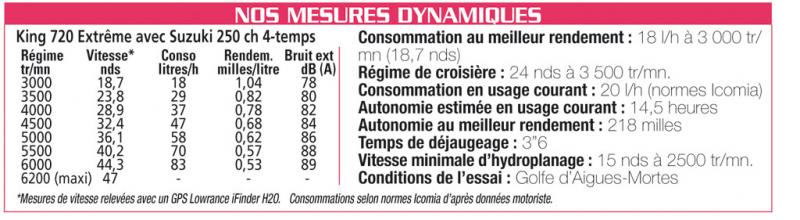 L'équipement standard mérite lui aussi des louanges. Il inclut en effet bon nombre d'accessoires souvent proposés en option : guindeau électrique, gonfleur électrique, direction hydraulique, roll-bar avec feux de navigation et avertisseur intégrés...à ce bilan «cockpit» largement positif, le King 720 ajoute une prometteuse carène en V profond, ultra-longue (ce qui devrait favoriser la stabilité longitudinale) avec une étrave fine en pointe de flèche et une bonne répartition des poids (le réservoir de carburant, 320 l tout de même, est placé au centre de gravité). Voyons ce qu'il en est, en commençant une légère tendance à bouchonner à l'arrêt, tout au moins avec seulement deux personnes à bord, car les flotteurs sont alors au-dessus de l'eau, ce phénomène disparaissant avec un peu de charge. C'est bien le seul point faible de ce modèle très marin qui aligne les bons points. Il déjauge bien en ligne et sans cabrer, la longueur de la carène procurant une bonne sustentation, avec une capacité à rester déjaugé à basse vitesse (13-14 nds) malgré son V aigu. On trouve une vitesse de croisière économique super-confortable à 23-24 nœuds pour 3 500 tr/mn. Ensuite le plaisir croît au fil de la montée en régime. à 30 nœuds dans des vagues cassantes, on a la sensation d'un régime de croisière tranquille, avec une stabilité parfaite, y compris par mer de travers. ça passe toujours très facilement à 5 000 tours et plus de 36 nœuds, la carène amortissant toutes les vagues sans qu'aucun embrun ne mouille le cockpit. Au-delà, le pilotage dans cette mer courte demande du doigté sur le trim et l'accélérateur, mais à aucun moment le 720 n'est à la peine, nous gratifiant d'un long bord à 44 nœuds, vent et mer debout, et d'une pointe à 47 nœuds. Trois qualités se dégagent de ce test : sécurité, plaisir de pilotage, et confort dans la mer. Que demander de plus ?.