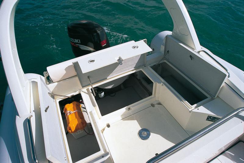 Dans la gamme déjà riche du constructeur italien, le nouveau King 720 vient s'intercaler entre le 670 et le 750. De même largeur que ce dernier et doté d'une carène très proche, il pourrait même le concurrencer sérieusement...voire le remplacer à terme, compte tenu de tarifs eux aussi très voisins. Comme tous les King, le nouveau 720 se classe parmi les pneus haut de gamme, avec une qualité de fabrication et de finition sans compromis, que ce soit pour le flotteur, en Néoprène-Hypalon à six compartiments, ou pour la partie polyester, qui présente un aspect impeccable, une excellente rigidité en navigation, et un design fluide. Dommage que le massif de proue, très proéminent, alourdisse quelque peu la silhouette (mais on apprécie sa large surface antidérapante quand on embarque par l'avant). L'accastillage et les détails de finition sont tout aussi soignés, à l'image des valves de flotteur en inox ou des petites portes en teck, très classe (sans même parler du plancher teck optionnel, le summum du raffinement). Ce tableau lumineux comporte néanmoins quelques ombres. Par exemple, le manque de mains courantes et de renforts-marchepieds sur les boudins, ou la faute de goût du tableau de bord en faux carbone. Plus gênant, les loquets de capots nécessitent une clé spéciale chaque fois que l'on veut accéder à un coffre ; vraiment pas pratique, sans compter le risque de perte ou de casse de la clé (en plastique) !Côté espace, le King 720 offre un cockpit sensiblement plus long (5,43 m) que ses concurrents de même taille, ceci grâce à sa carène ultra-longue qui recule le tableau arrière au niveau de l'extrémité des flotteurs. Cet avantage est renforcé par une exploitation intelligente de l'espace, avec un poste de pilotage central départageant deux zones, avant et arrière, toutes deux très conviviales. L’adoption d’un leaning-post favorise le pilotage debout (ce dont on ne se plaindra pas), avec un appui sur le bas du dos un peu surprenant au début, mais confortable à l’usage. De plus, la forme «rentrante» de la console permet de bien avancer les pieds quand on se cale sur le leaning-post. En revanche, mieux vaut oublier la position fauteuil (avec l’assise basculée vers l’avant) : on est assis trop haut, sans cale-pied, et le mini-dossier est dur.