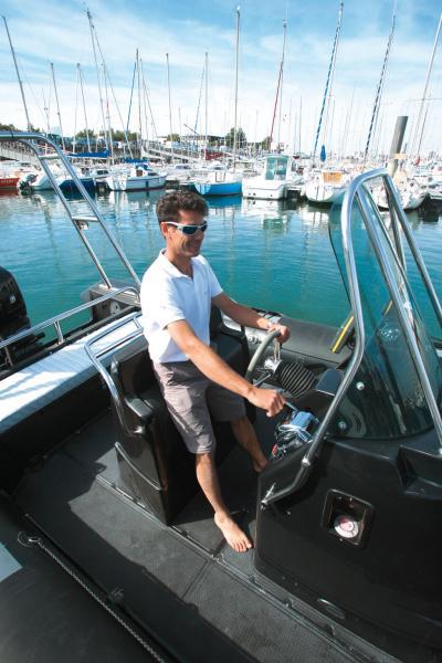 Du coup, en virage, on apprécie de placer le nez avec précision, et de dessiner une trajectoire propre grâce à la gîte intérieure prononcée, accompagnée d’une légère glisse qui évite la « prise de carre » violente. Même en refermant les virages au maximum, nous n’avons pas déclenché de ventilation de l’hélice, ce qui nous a permis de goûter le punch (pour un 4-temps) du Verado lors des relances en sortie de courbes. Au chapitre des performances, il y a de quoi s’avouer satisfait. Au-delà des 45 nœuds en pointe, avec quatre personnes à bord et malgré le poids du bateau, il convient de souligner les 3,5 secondes au déjaugeage. Mais, le plus intéressant tient à l’éventail des allures de promenade… Rendez-vous compte : grosso modo, il est possible de choisir entre 2 500 tr/mn et 5 000 tr/mn pour la balade, en fonction de l’état de la mer, avec des vitesses de croisière qui vont s’étendre entre 15 et 40 nds environ, avec une consommation plus ou moins économique (au-dessus, le Verado se montre très gourmand). Avec ce semi-rigide, nous retiendrons 28,5 nds (3 900 tr/mn) comme la vitesse idéale, le 6 cylindres en ligne se montrant encore très discret à ce régime. Une petite critique néanmoins, concernant l’autonomie qui, d’après nos calculs, devrait se situer sous les 150 nautiques. Avec une telle machine à dévorer les milles, homologuée en B et pour 400 ch, Sillinger aurait pu faire un effort côté réservoir ! De retour au port, le tour du propriétaire est facile à faire, grâce à une aisance de circulation dans le cockpit qui reste un point fort chez Sillinger. La construction respire le sérieux, avec des flotteurs en Orca bien assemblés, une coque renforcée par des poutrelles inox, un échantillonnage de stratifié rarement atteint sur ce genre de bateau - ah on peut sauter à bord sans crainte ! - et un accastillage inox toujours aussi robuste et généreux (trois bittes d’amarrage !). Les coffres aussi sont nombreux et peuvent recevoir un cadenas. Le pack Silverline apporte un confort bienvenu pour les enfants ou les amis : solarium à l’avant, coussin de banquette à l’arrière (trois places), échelle de bain et douchette (sur demande). Dommage qu’un bimini ne soit pas livré de série…