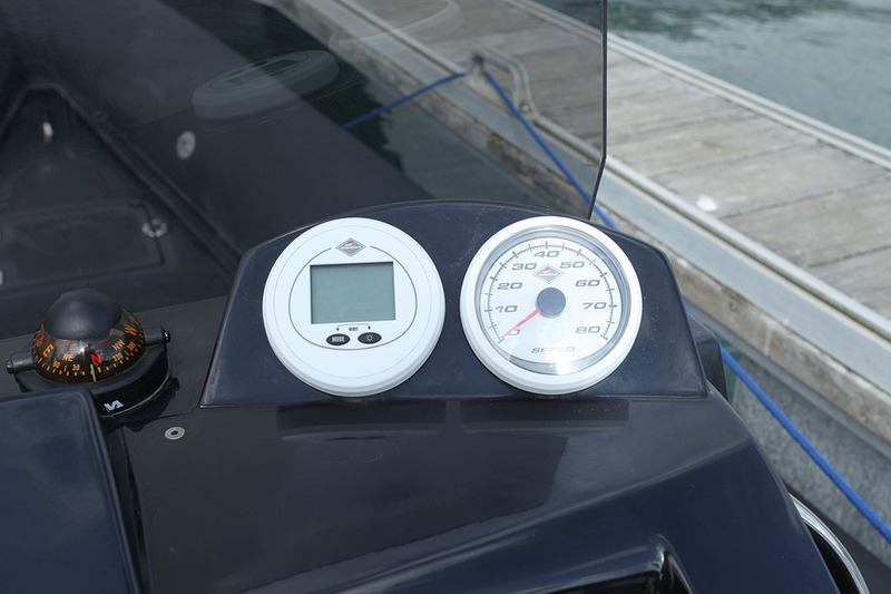 De retour au port, l'inspection d'usage ne manque pas d'intérêt. Simple, le 565 Coach n'en est pas moins accueillant. Bien construit, il donne une impression de robustesse et l'on ne peut qu'apprécier l'assemblage soigné des flotteurs (dans la longueur), en tissu Orca "Fabric Impression", doublés par endroits de pièces d'usure pour servir d'assise et dotés de valves de surpression. Autre bon point sur ce genre de bateau, la présence de rangements assez généreux, avec le coffre sous la banquette (biplace), celui de la console (même si la batterie mange un peu de volume), et les deux cales de l'avant, la plus en pointe servant de coffre pour le mouillage, avec un couvercle échancré pour laisser passer la chaîne. La manœuvre s'effectue à l'aide d'un guide de mouillage et d'un taquet inox. Le poste de pilotage se compose d'une paire de bolsters à dosserets de hauteur réglable et d'une console haute, avec un tableau de bord spacieux, pouvant recevoir un GPS/sondeur grand écran, et une niche pour l'intégration du boîtier de commandes. Le nable de remplissage du réservoir est placé dans le flanc tribord de la console, le réservoir se trouvant sous celle-ci. Parmi les avantages proposés par le chantier, il est possible de disposer les éléments de pont à l'endroit désiré, et de choisir sa couleur de gel-coat et de flotteurs moyennant un supplément très raisonnable.