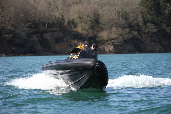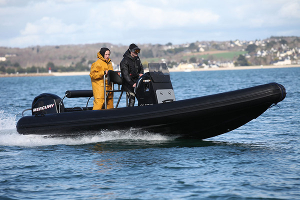 Ce chantier portugais, fondé en 1990, a pris le parti de la sportivité, proposant des semi-rigides dont la conception s'apparente à celle des productions anglaises. A savoir, des bateaux à la ligne effilée, du fait d'une carène en V profond, longue et plutôt étroite, ceinte de flotteurs à diamètre progressif (plus fins à la proue qu'à la poupe), et au pont aménageable "à la carte", essentiellement dans l'optique de la promenade sportive ou de la pêche. La gamme compte aujourd'hui une dizaine de modèles, de 5,25 m à 7,37 m, tous ces semi-rigides étant équipés de flotteurs en tissu Orca (type Néoprène/Hypalon). Dans sa robe intégralement noire (carène et pont, tissu de flotteurs, accessoires de pont), notre bateau d'essai s'engage sur la cale de mise à l'eau de Port La Forêt. Le temps de jeter un oeil à ses oeuvres vives montrant une quille à 24 degrés au tableau arrière, un redan de déjaugeage à mi-longueur, des entrées d'eau fines et un brion d'étrave fuyant. En un temps trois mouvements, l'Hydrosport est à flot. Il est vrai que sa légèreté (moins de 400 kilos sans moteur !) et sa relative étroitesse rendent faciles la manutention et le transport sur remorque. Sur son tableau arrière, un Mercury 115 EFI, soit la puissance maxi autorisée. Une puissance qui n'a rien de "démoniaque", mais qui sur un bateau aussi léger que le 565 Coach lui permet d'afficher un rapport poids/puissance très flatteur : 4,7 kilos par cheval. Cueillis à froid par un violent grain, dès la sortie du port, nous cherchons à semer ce gros nuage anthracite… Ce faisant, on constate que la carène de l'Hydrosport profite de son redan pour bien amortir le clapot, grâce à la compression de l'air derrière ce décrochement. Une fois le soleil revenu, nous sortons le chrono pour mesurer les accélérations. Sans être phénoménales, elles sont énergiques : 4 secondes pour déjauger (presque sans cabrage) et moins de 6 pour dépasser les 20 nœuds. Le 4-cylindres américain pousse jusqu'à 6 150 tr/min, sans faiblir, avec à la clé une très belle pointe de vitesse : 42,2 nœuds !