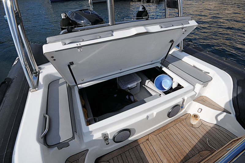 Amarré au Port Ouest de l'Estaque, le Dorado 7.5 présente bien et ne cache rien de ses intentions, avec un vaste cockpit conçu pour les virées au soleil et le farniente dans les criques. Au premier regard, on remarque la réalisation soignée, qu'il s'agisse du gros œuvre ou des finitions. Pour le premier, une plongée dans les fonds, fortement structurés par des cloisons et de gros longerons stratifiés, rassure tout de suite quant à la robustesse de la coque et du pont. Il en va de même pour le flotteur à six compartiments, soigneusement réalisé en Néoprène-Hypalon, avec double liston de protection périphérique et mains courantes en cordage Nylon, offrant une bonne prise. La ligne a du caractère, avec sa proue légèrement surélevée et son flotteur coupé "à l'italienne", s'affinant vers l'étrave. Le tout se complète d'un design de pont élégant auquel quelques touches de teck apportent une note de luxe. Le tout est traité dans un esprit marin (sans angles vifs), avec des détails soignés, à l'exemple des fermoirs de coffres encastrés, de l'excellent drainage du cockpit, ou de la face arrière de console ouvrante, permettant d'accéder facilement aux câblages. Enfin, tous les accessoires sont de bonne facture, de l'accastillage à la sellerie, et l'équipement standard y est plus que généreux.