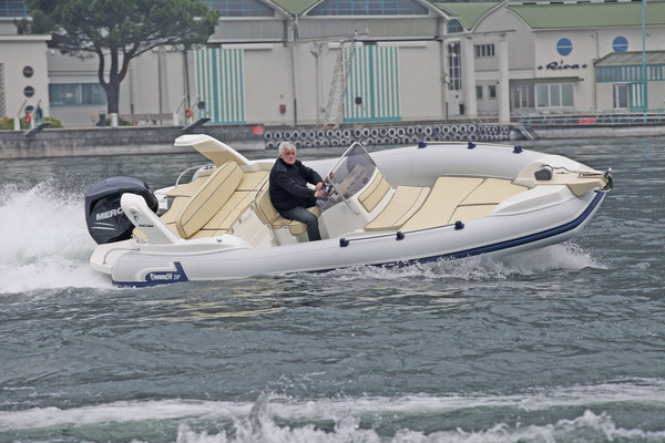 Ce titre ne convient pas vraiment puisque nous avons essayé semi-rigide sur le Lac Iseo, dans le nord de l'Italie. Le croisement des sillages d'autres bateaux (mais pas de grosses embarcations) se fait en douceur, grâce à l'étrave incisive du Marlin. Mais cela n'est pas une surprise, ni un exploit. Par contre les ratios distance parcourue/essence consommée, sont remarquables, avec à la clé une autonomie qui devrait dépasser les 200 milles et permettre d'espacer les passages à la pompe, une corvée en haute saison. Peu à l'aise en virage, sans toutefois se montrer dangereux, le Marlin doit se manier en douceur dans ce domaine. Les reprises du Verado en sortie sont consistantes, la ventilation de l'hélice n'intervenant que lorsqu'on braque à fond et qu'on remet les gaz sans discernement.
