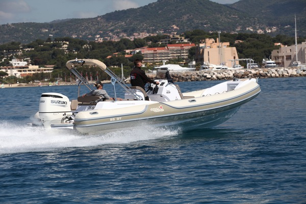 La baie du Lavandou, face au siège d’AGP Boats qui a mis ce bateau à notre disposition, est bien calme en cette matinée d’essai. Bien pour les mesures de performances, moins bien pour évaluer la tenue à la mer… Précisons que la carène du bateau d’essai avait séjourné à flot et arborait un petit duvet d’algues, apte à lui faire perdre deux ou trois nœuds de vitesse maxi, un peu moins sur les allures de croisière… Compte tenu de ce petit handicap, les chiffres obtenus sont satisfaisants, d’autant que le 25 GT peut recevoir jusqu’à 50 chevaux supplémentaires. Avec la puissance maxi autorisée, et une carène propre, les 45 nœuds seront tout à fait dans ses cordes… En attendant, nous nous sommes contentés de 40,6 nœuds. Par contre, les accélérations se sont avérées particulièrement vigoureuses, avec un 200 ch Suzuki dans sa version 6 cylindres, délivrant un couple sensiblement plus important que le 4 « pattes », plus récent. En témoigne le temps canon au déjaugeage : 2’’7 ! Il est vrai que l’hélice de l’essai, une 20 pouces, tirait un peu court puisque nous avons pris 6 200 tr/min soit 200 tours de plus que le chiffre motoriste. Donc, une hélice davantage propice aux montées en régime qu’à la vitesse de pointe… Propice également aux reprises en sortie de virage serrés. En l’absence totale de ventilation de l’hélice, les remises en vitesse sont assez fulgurantes. Par contre, les virages pris énergiquement ne constituent pas l’exercice préféré du 25 GT qui, surtout dans les courbes à droite, a tendance à perdre sa gite intérieure pour se relever droit sur sa quille. Une attitude pas très agréable pour pilote et passagers, avec la crainte d’un départ en contre-gite... Pour le reste, ce semi-rigide se montre très stable à vitesse maxi, même avec une bonne dose de trim positif, que ce soit en latéral, ou en longitudinal en sautant les sillages des vedettes que nous sommes allés chercher, dans la mesure ou le plan d’eau était encore « endormi ». La carène en V évolutif du 25 GT, si elle se montre confortable dans le petit clapot ou en croisement de sillages, n’est pas très vivante à piloter (la salissure en est aussi responsable). Elle est en tout cas facile à prendre en main avec 200 chevaux, et la confiance s’instaure rapidement entre le pilote et sa monture. A notre avis, elle supportera sans mal un 250 ch, pour ceux qui voudraient conserver un haut niveau de performance en navigant à pleine charge.